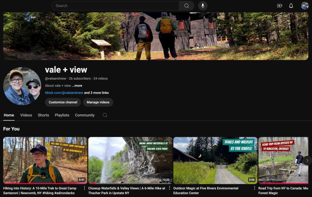I also co-created the new YouTube channel Vale + View with the goal of reminding myself how to find a gorgeous view not only at the top of a mountain, but at every step along the way. In addition to cohosting, my duties for this channel include scriptwriting, filming video on iPhone and DJI Osmo Pocket 3 cameras, editing in Adobe Premiere, and social media posting.
