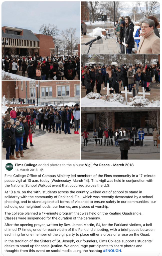 At Elms College, I operated the institutional social media accounts (Facebook, Twitter, Instagram, and more) from December 2014 to August 2019, sharing news from campus