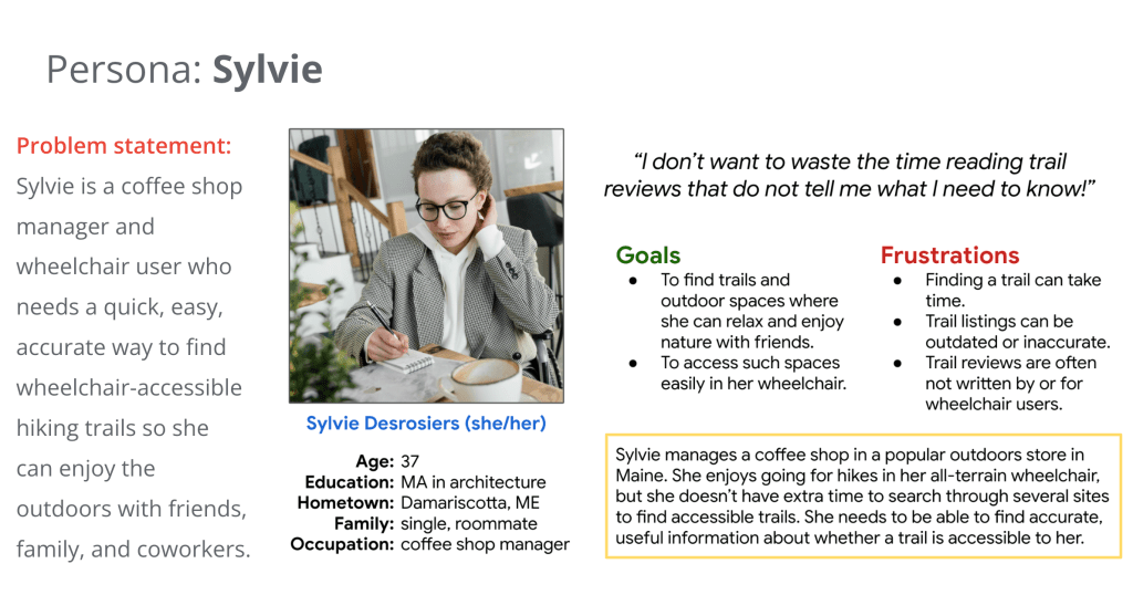 Sylvie, 37, is a coffee shop manager and wheelchair user who needs a quick, easy, accurate way to find wheelchair-accessible hiking trails so she can enjoy the outdoors with friends, family, and coworkers.