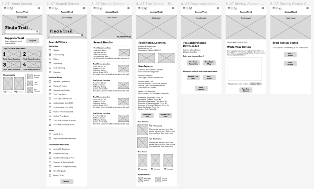 Low-fidelity prototype: My low-fidelity prototype followed the user flow through searching for and selecting a trail, downloading its map, and posting a review, so users could test the product’s usability. View the AccessiTrail app lo-fi prototype here.
