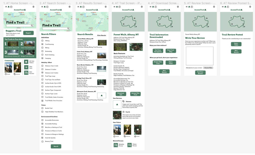 High-fidelity prototype: The high-fidelity prototype followed the user through finding a trail, from searching and selecting a trail through downloading info and posting a review, so users could test the app’s usability. View the AccessiTrail app high- fidelity prototype here.
